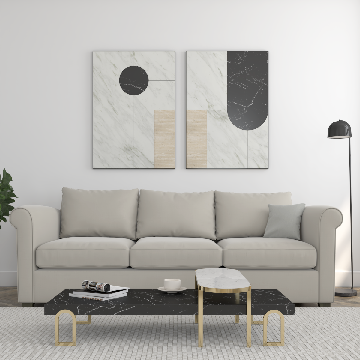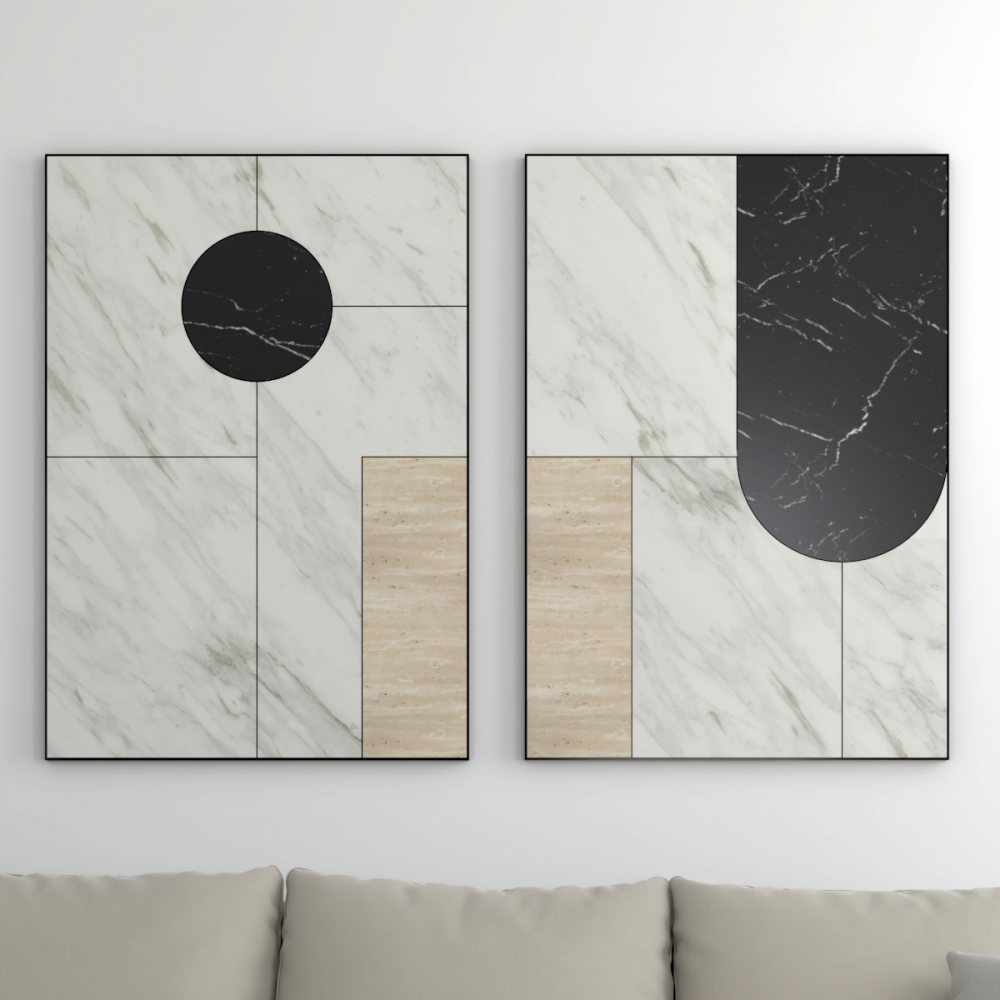 La rencontre des différents marbres transforme la pierre en œuvre d’art. Les deux tableaux apportent une touche que l’on pourrait qualifier de style art déco dans l’univers de la maison ou du bureau.