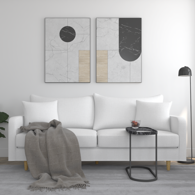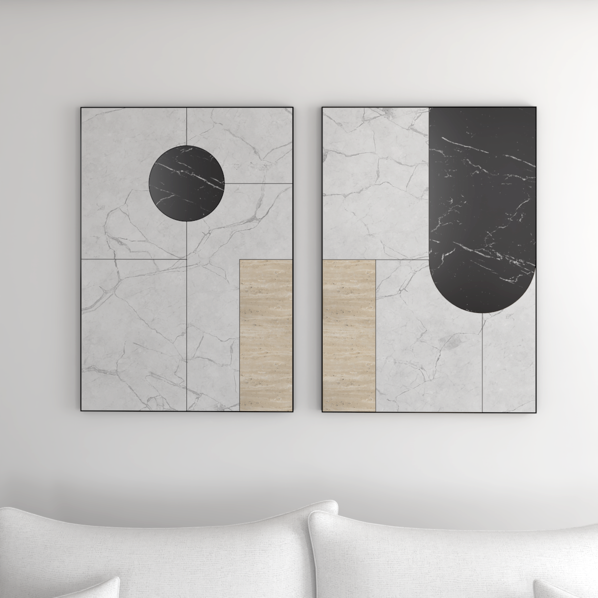La rencontre des différents marbres transforme la pierre en œuvre d’art. Les deux tableaux apportent une touche que l’on pourrait qualifier de style art déco dans l’univers de la maison ou du bureau.
