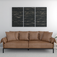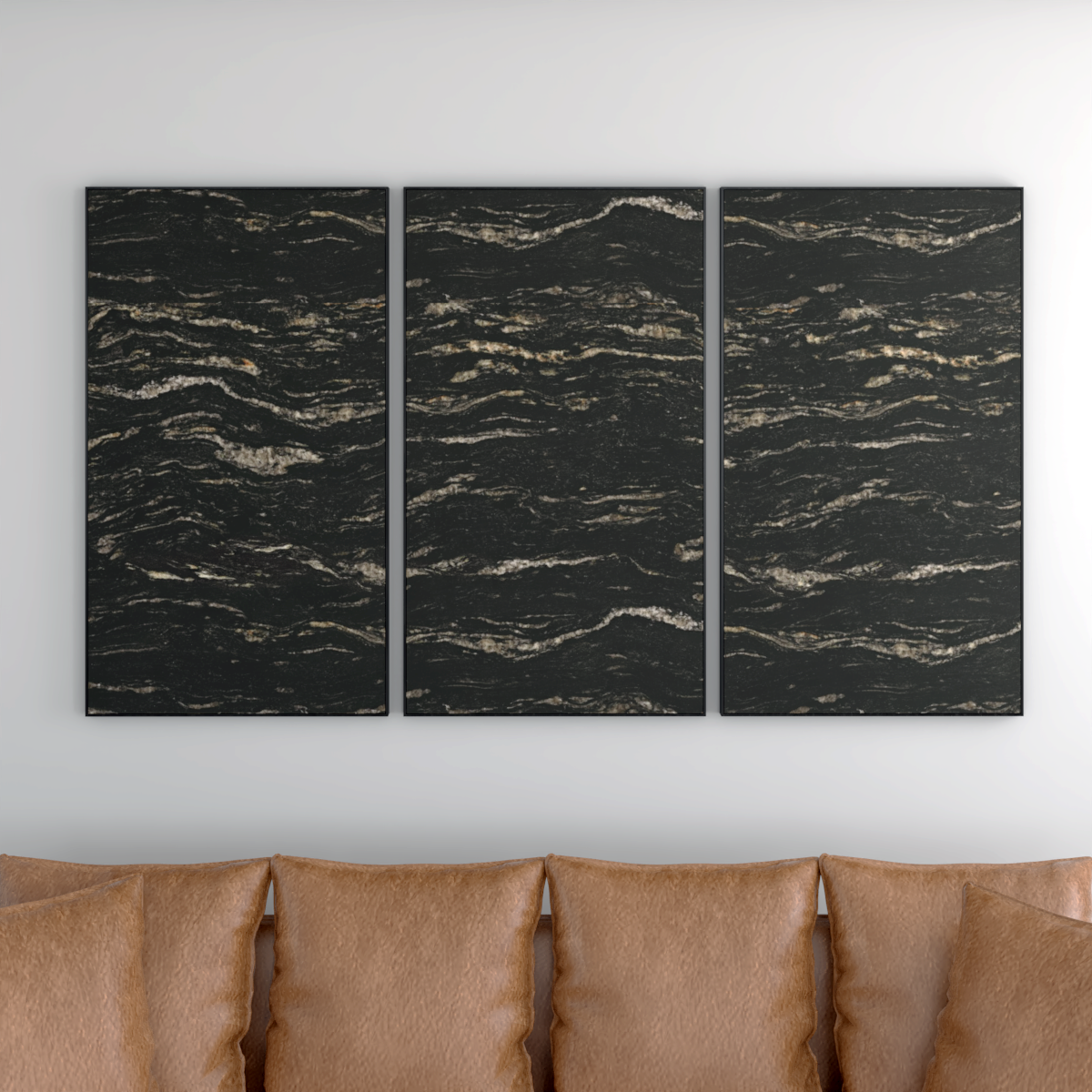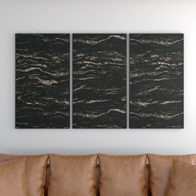 C’est le cas ici avec ce lot de 3 tableaux en marbre Black Cosmic sur nid d’abeille ce qui rend les éléments légers et résistants. La roche sombre veinée irrégulièrement de beige est cernée d’un cadre en chêne noir.