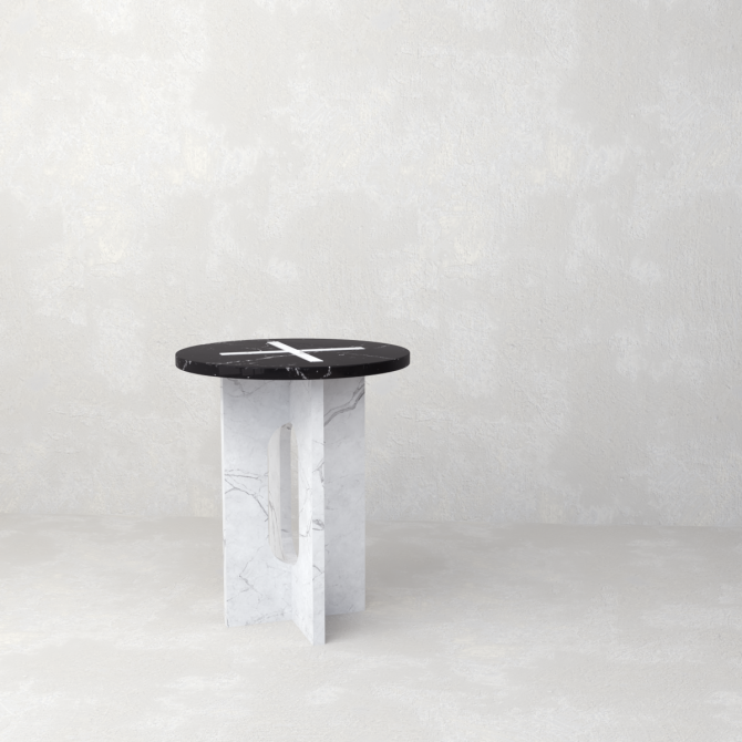 Quando o funcional encontra a obra de arte! A mesa de apoio TESO destaca as subtis variações de mármore natural. Linhas e curvas cruzam-se num só. A estrutura de mármore travertino serve de apoio ao tampo de mármore preto marquina.